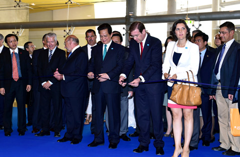 | Thủ tướng Chính phủ Nguyễn Tấn Dũng và Thủ tướng Bồ Đào Nha Pedro Passos Coelho cắt băng khai trương Hội chợ triển lãm Kinh tế biển. |