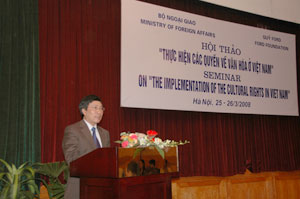 Phát biểu khai mạc Hội thảo, Thứ trưởng Thường trực Bộ Ngoại giao Phạm Bình Minh đã khẳng định tầm quan trọng của quyền văn hóa như một bộ phận không thể tách rời trong tổng thể các quyền tự do cơ bản của con người, được ghi nhận trong nhiều văn kiện quốc tế về nhân quyền và nhấn mạnh chính sách nhất quán của Nhà nuớc VN là tôn trọng, bảo vệ và phát huy quyền văn hóa của người dân, góp phần tăng cường sức mạnh và nền tảng tinh thần của dân tộc trong quá trình xây dựng và bảo vệ đất nước. Trong thời kỳ Đổi mới, chủ trương của Đảng và Nhà nước là xây dựng một nền văn hóa VN tiên tiến, đậm đà bản sắc dân tộc, bảo đảm và đáp ứng tốt hơn các yêu cầu phát triển về mọi mặt của xã hội và con người trong quá trình công nghiệp hóa, hiện đại hóa và hội nhập kinh tế quốc tế. Tăng trưởng kinh tế là quan trọng nhưng không phải là mục tiêu duy nhất, mà điều cốt lõi là không ngừng nâng cao chất lượng cuộc sống và phát triển con người về mọi mặt; đồng thời văn hóa là động lực quan trọng thúc đẩy sự phát triển kinh tế xã hội.