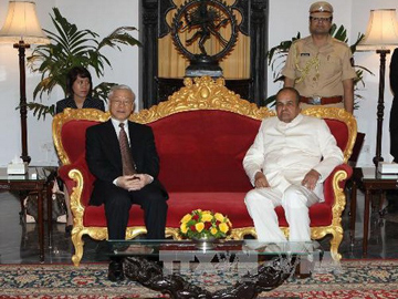 | Tổng Bí thư Nguyễn Phú Trọng hội kiến với Thống đốc bang Maharashtra Kateekal Sankaranaryanan. (Ảnh: Trí Dũng/TTXVN) |