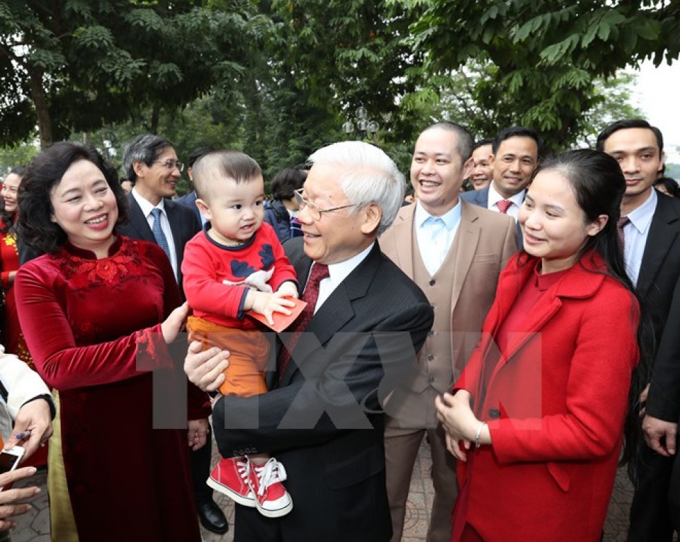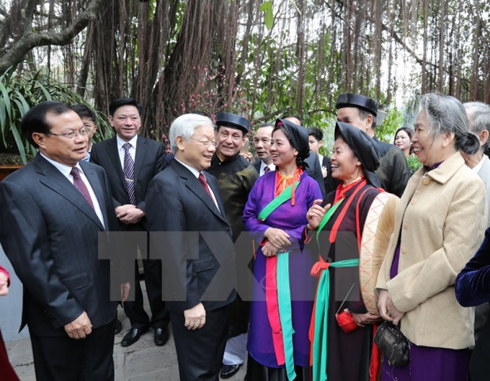 | Tổng Bí thư Nguyễn Phú Trọng gặp gỡ, chúc Tết người dân Thủ đô. (Ảnh: Trí Dũng/TTXVN) |