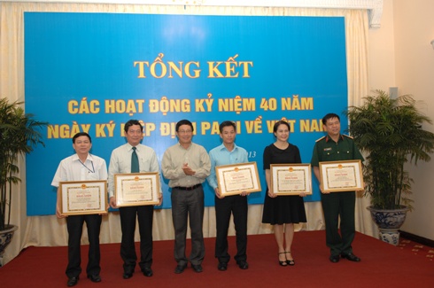 Cũng nhân dịp này, Bộ trưởng Ngoại giao Phạm Bình Minh đã trao tặng Bằng khen cho các tập thể và cá nhân đã có những đóng góp tích cực trong việc tổ chức và phối hợp triển khai các hoạt động kỷ niệm 40 năm Ngày ký Hiệp định Paris về Việt Nam.