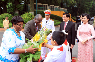 | Chủ tịch nước Trương Tấn Sang và Phu nhân đón Tổng thống Hifikepunye Pohamba và Phu nhân. (Ảnh: TTXVN) |