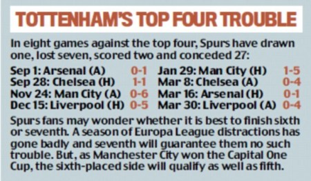 Tottenham hiện gặp rất nhiều khó khăn trong việc cạnh tranh một suất trong tốp 4, bởi khoảng cách giữa họ với đội xếp thứ 4 là Arsenal đã bị gia tăng lên thành 8 điểm./.