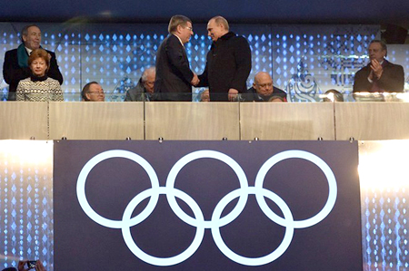 | Tổng thống Nga Vladimir Putin bắt tay Chủ tịch IOC Thomas Bach tại lễ khai mạc Sochi 2014 (Nguồn: TTXVN) |