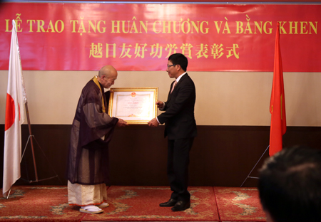 | Bộ trưởng Phạm Bình Minh thừa ủy quyền của Thủ tướng trao tặng Bằng khen cho hòa thượng Yoshimizu Daichi. |