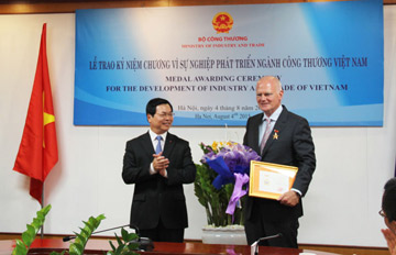 | Bộ trưởng Bộ Công Thương Vũ Huy Hoàng trao kỷ niệm chương cho Đại sứ, Trưởng phái đoàn EU tại Việt Nam Franz Jessen. (Ảnh: K.T) |