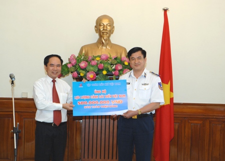 | Ông Nguyễn Quốc Thập, Phó Tổng giám đốc PVN trao quà cho lực lượng Cảnh sát biển và lực lượng Kiểm ngư. Ảnh: Minh Châu |
