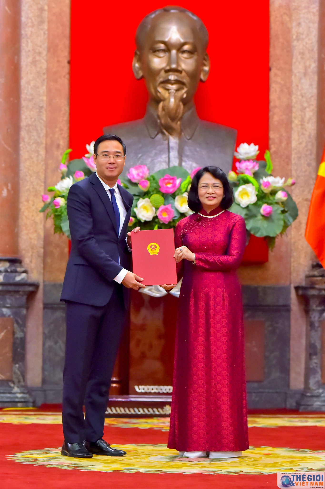 | Phó Chủ tịch nước Đặng Thị Ngọc Thịnh trao Quyết định cho ông Trần Việt Thái, Phó Viện trưởng Viện Nghiên cứu chiến lược ngoại giao, Học viện Ngoại giao kiêm Phó Vụ trưởng Vụ Chính sách đối ngoại, Bộ Ngoại giao - người được bổ nhiệm làm Đại sứ đặc mệnh toàn quyền nước Cộng hòa xã hội chủ nghĩa Việt Nam tại Malaysia. |