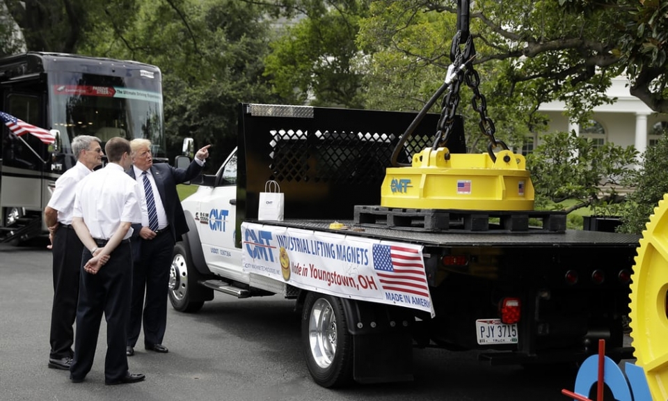 | Tổng thống Donald Trump và Chủ tịch Công nghệ kiêm Tổng Giám đốc Michael Kovach (bên trái) và Chip Kovach - con trai của ông Kovach, Phó Chủ tịch phụ trách kỹ thuật cùng trao đổi, khi họ nhìn vào một thiết bị nam châm công nghiệp. (Nguồn: AP) |