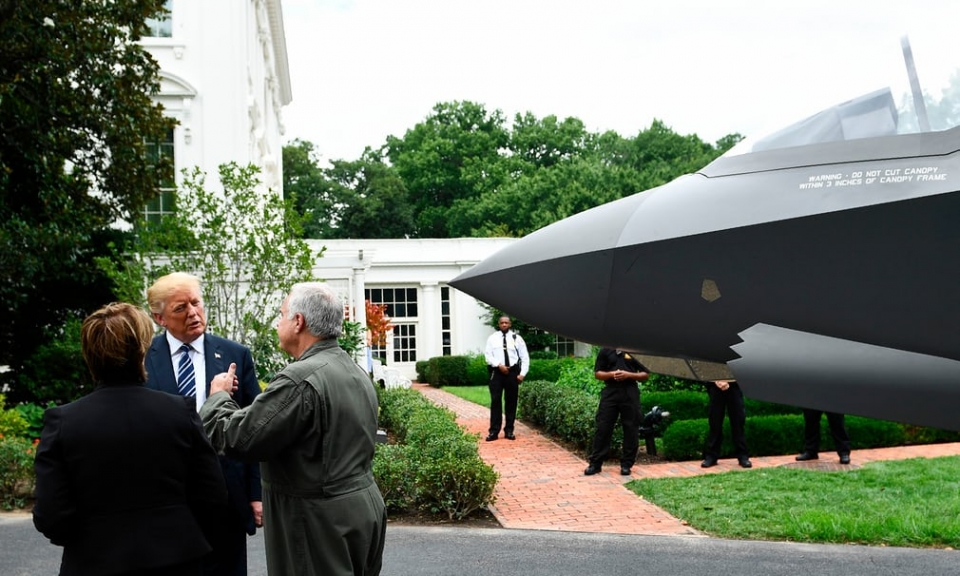 | Ông Trump trao đổi với Alan B Norman - Giám đốc, phi công trưởng phụ trách thử nghiệm của máy bay chiến đấu Lockheed Martin F-35. (Nguồn: Getty Images) |