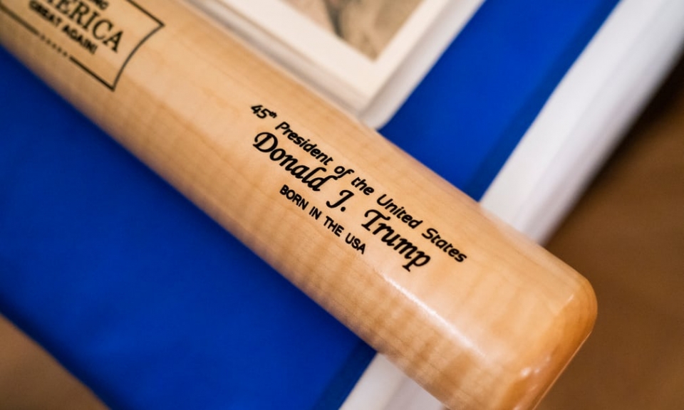 | Gậy bóng chày BWP có khắc tên vị tổng thống thứ 45 của nước Mỹ được trưng bày tại Phòng Đông của Nhà Trắng. (Nguồn: EPA) |