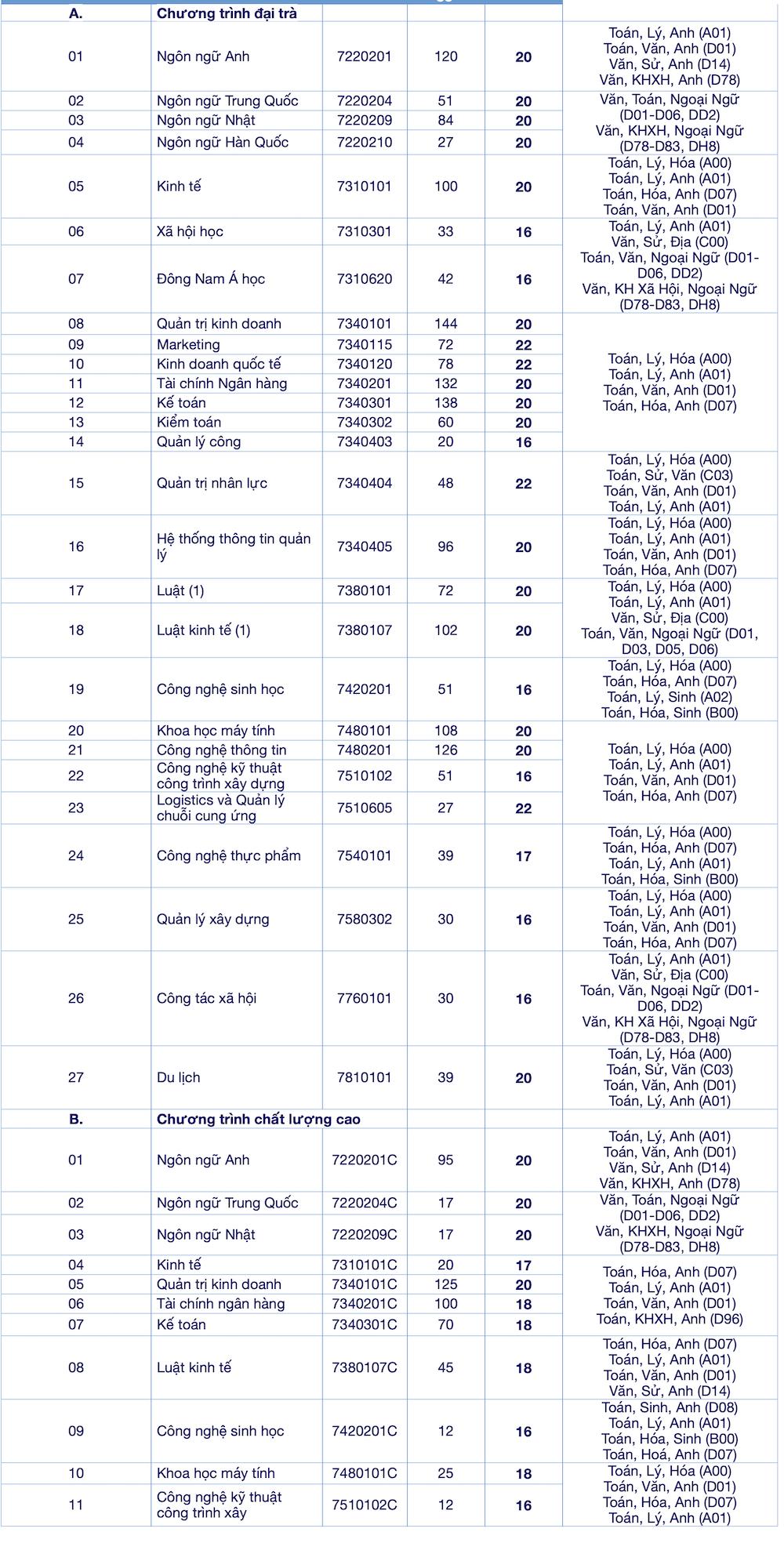 Theo đó, 3 ngành có điểm sàn xét tuyển cao nhất là ngành Kinh doanh quốc tế, Marketing và Logistics và Quản lý chuỗi cung ứng, điểm sàn của cả 3 ngành này là 22 điểm.