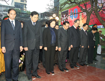| Các đồng chí lãnh đạo Đảng, Nhà nước, thành phố Hà Nội tưởng niệm các nạn nhân của B52 ở Khâm Thiên. (Ảnh: CPV) |