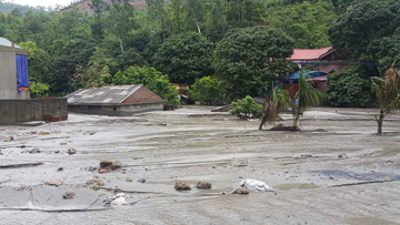 | Hàng ngàn khối đất đá của bãi chứa thải xỉ than công ty Than Mông Dương bị mưa lớn cuốn trôi đã lấp, ngập kín 70 nhà dân khu vực Đông Cao Sơn. |