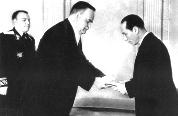 | Đại sứ đầu tiên của nước Việt Nam DCCH Nguyễn Lương Bằng trình thư ủy nhiệm lên Chủ tịch Đoàn Chủ tịch Xô viết tối cao Liên Xô. |