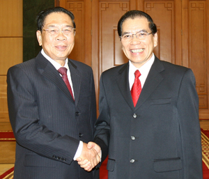 | Tổng Bí thư Nông Đức Mạnh đón Tổng Bí thư Đảng Nhân dân Cách mạng Lào, Chủ tịch nước CHDCND Lào Chummaly Xaynhaxon, ngày 23/4. |