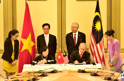 | Thủ tướng Nguyễn Tấn Dũng và Thủ tướng Najib Razak ký Tuyên bố về Khuôn khổ quan hệ Đối tác chiến lược Việt Nam-Malaysia. (Ảnh: Nhật Bắc) |