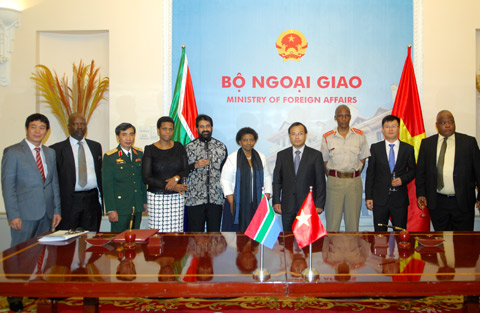 | Thứ trưởng Bộ Ngoại giao Vũ Hồng Nam và Thứ trưởng Bộ Hợp tác và Quan hệ quốc tế Nam Phi Nomaindiya Mfeketo ký biên bản kỳ họp. |