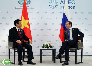 | Chủ tịch nước Trương Tấn Sang và nguyên Tổng thống Nga Dmitry Medvedev tại APEC 2011. |