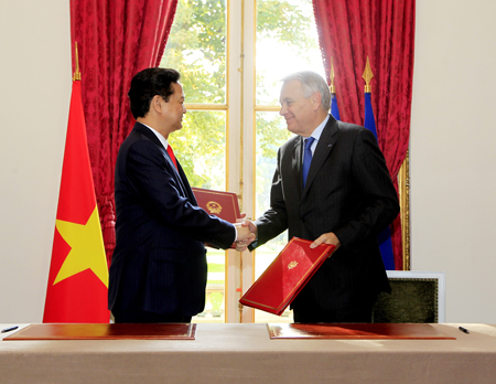 | Thủ tướng Nguyễn Tấn Dũng và Thủ tướng Pháp Jean-Marc Ayrault ký Tuyên bố chung về Quan hệ Đối tác chiến lược Việt Nam-Pháp. (Ảnh: Đức Tám/TTXVN) |