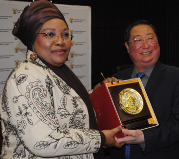 | Bộ trưởng Giàng Seo Phử trao quà lưu niệm cho Chủ Chủ tịch Ủy ban Dân tộc Nam Phi Thoko Mkhwanazi-Xaluva. |